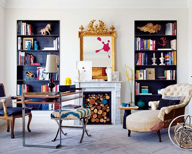 A more traditional office space but because of the art work, lamp, use of colours, rug and Eames chair it makes for an eclectic room where I wouldn’t mind spending some time.